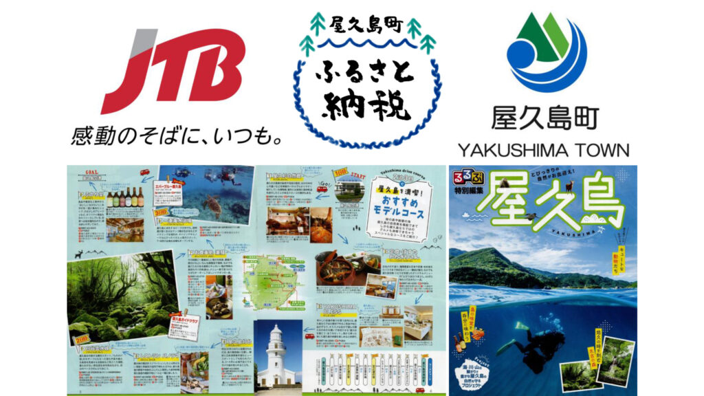 【上左】海底清掃事業を請け負ったJTBパブリッシングが入るJTBグループのロゴとスローガン【上中・上右】「屋久島町ふるさと納税」と屋久島町のロゴ(町ウェブサイトより)【下】屋久島町がJTBパブリッシングに業務委託して制作した観光ガイド冊子「るるぶ特別編集 屋久島」