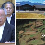 【左】裁判所から和解案が示されることを報告する屋久島町の荒木耕治町長=2025年6月9日、屋久島町議会【右上】屋久島町役場【右下】職員が過重労働で死亡した町営長峰牧場の衛星写真=Google Earthより