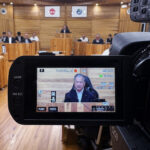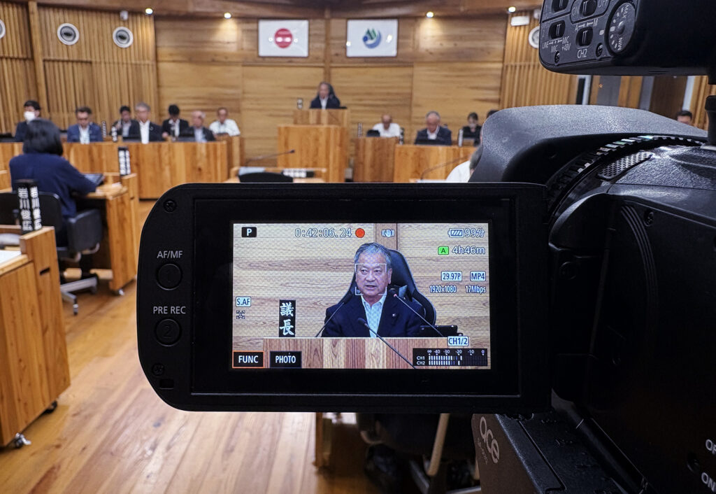 屋久島町議会の議事を進める石田尾茂樹議長を撮影する屋久島ポストのビデオカメラ=2025年6月20日、屋久島町議会