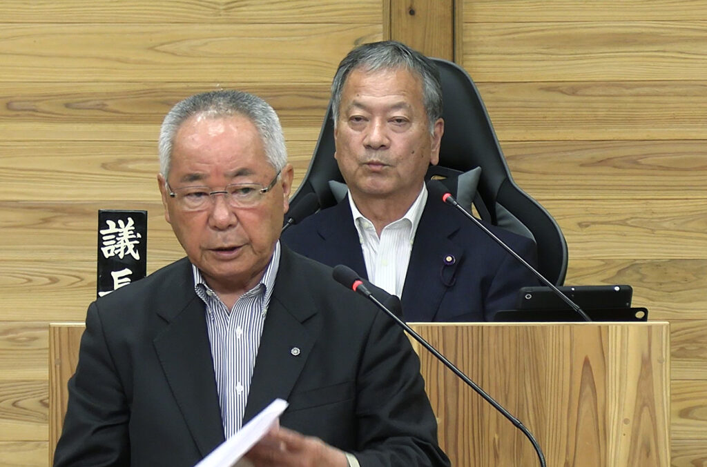 荒木耕治町長(左)が説明する補正予算案の提案理由を聞く石田尾茂樹議長=2025年6月20日、屋久島町議会
