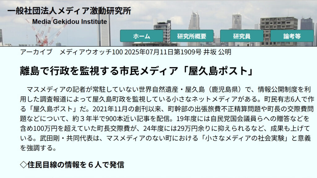 マスコミの元記者やメディアの専門家らでつくる一般社団法人「メディア激動研究所」は7月11日、屋久島町などで調査報道を続ける「屋久島ポスト」の活動を紹介する記事を配信した。時事通信社の元記者で、同研究所の井坂公明所長が記事を執筆し、屋久島ポストが報じてきた補助金不正請求事件や町長交際費問題などの成果について伝えた。
