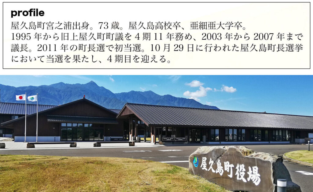 【上】2023年10月の屋久島町長選後、「町報やくしま」(2023年12月号)に掲載された荒木耕治町長のプロフィール【下】屋久島町役場