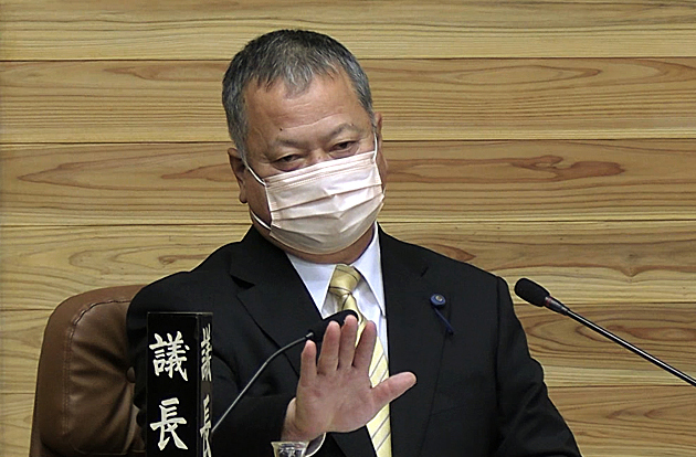 議員席から取材を拒否する理由を問われた後、手を出して町議の発言を制止する屋久島町議会の石田尾茂樹議長=2021年12月7日、屋久島町役場議会棟