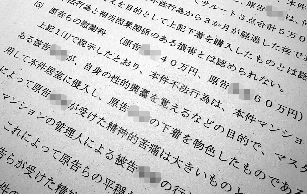 「本件不法行為は、本件マンションの管理人である被告が、自身の性的興奮を覚えるなどの目的で、マスターキーを使用して本件居室に侵入し、原告の下着を物色したものである」――。