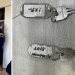 【左】女性入居者の下着が物色された現場を調べる鹿児島県警の捜査員【右】マンションの管理人が持ち歩いていたマスターキー。写真下の「2015 New Master」と記載された鍵を使って被害者の部屋に侵入した(被害者に開示された事件記録より※鍵の形状を伏せるために一部でモザイク加工をしています)