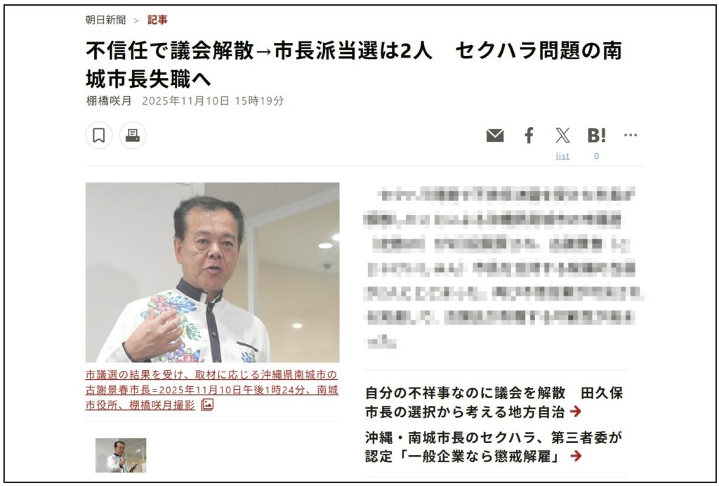 セクハラ問題で追及を受ける沖縄県南城市の古謝景春市長も、改選された市議会が2度目の不信任決議を可決するとみられ、田久保氏と同じく失職は免れない見通しだ。